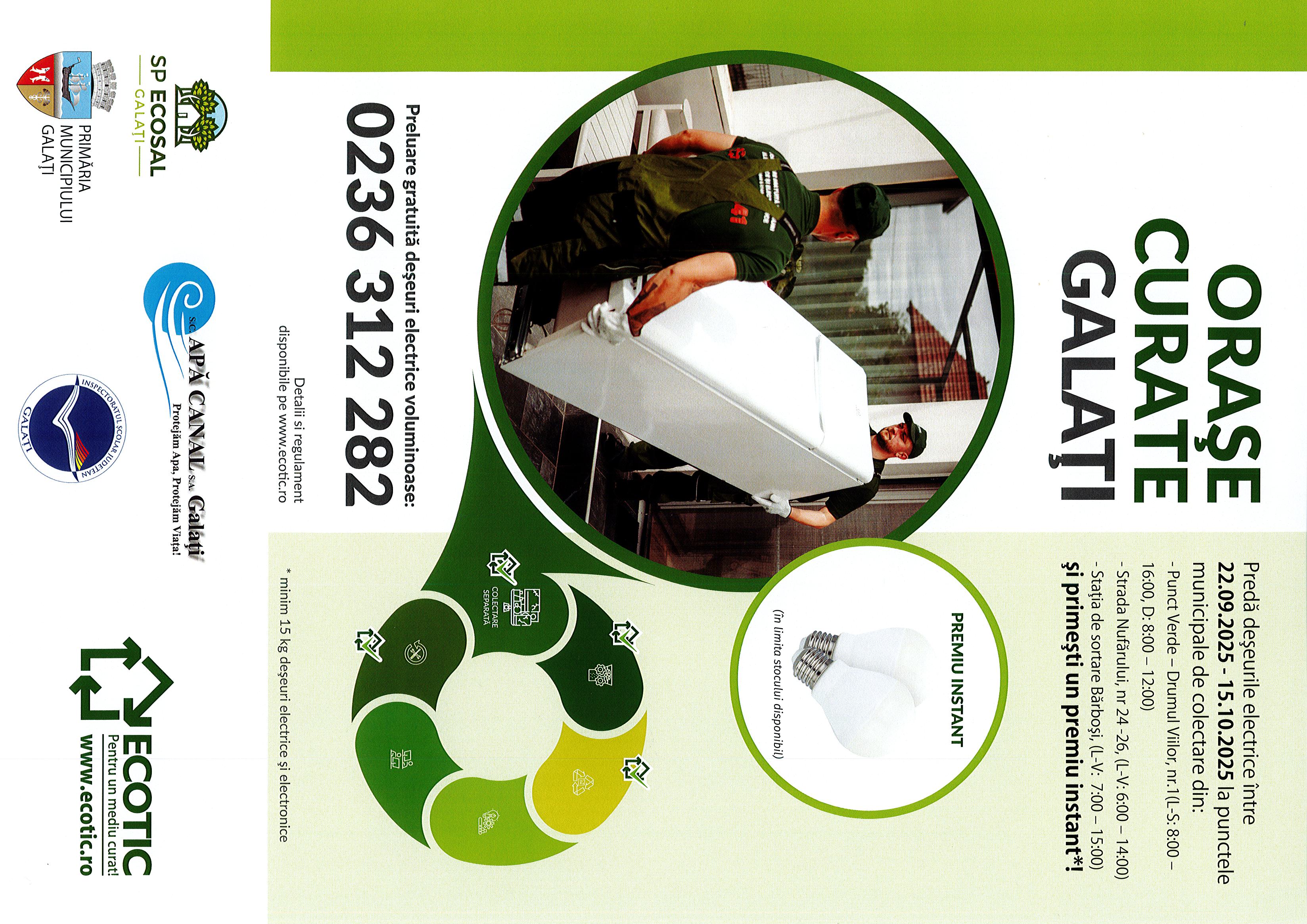 ORAŞE CURATE GALAŢI Predă deşeurile electrice între 22.09.2025 - 15.10.2025 la punctele municipale de colectare din:- Punct Verde - Drumul Viilo ...