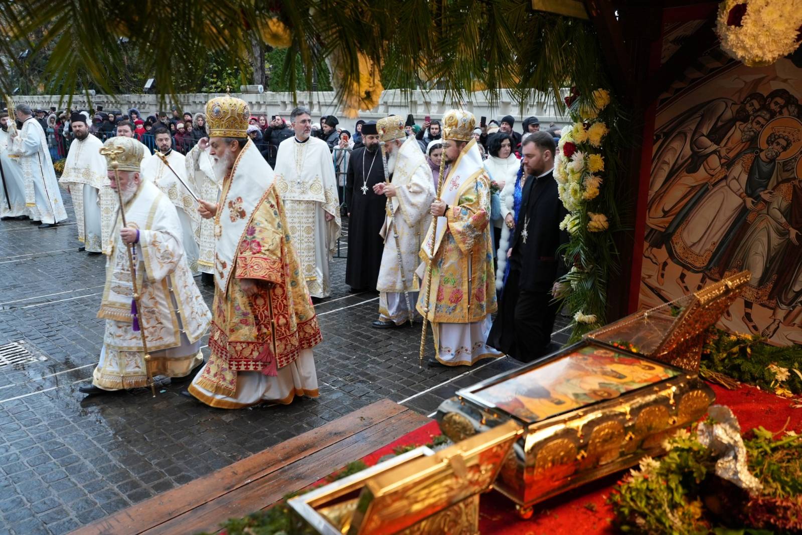 Înainte de oficierea Sfintei Liturghii, ierarhii prezenţi la sărbătoarea andreiană de la Galaţi s-au închinat la moaştele Sfântului Apostol Andrei, ale Sfinţilor Tămăduitori Pantelimon, Efrem cel Nou, Nectarie de Eghina şi Luca al Crimeei şi la cele ale Sfântului Ierarh Nicolae, aşezate spre venerare în baldachinul din proximitatea Catedralei arhiepiscopale.