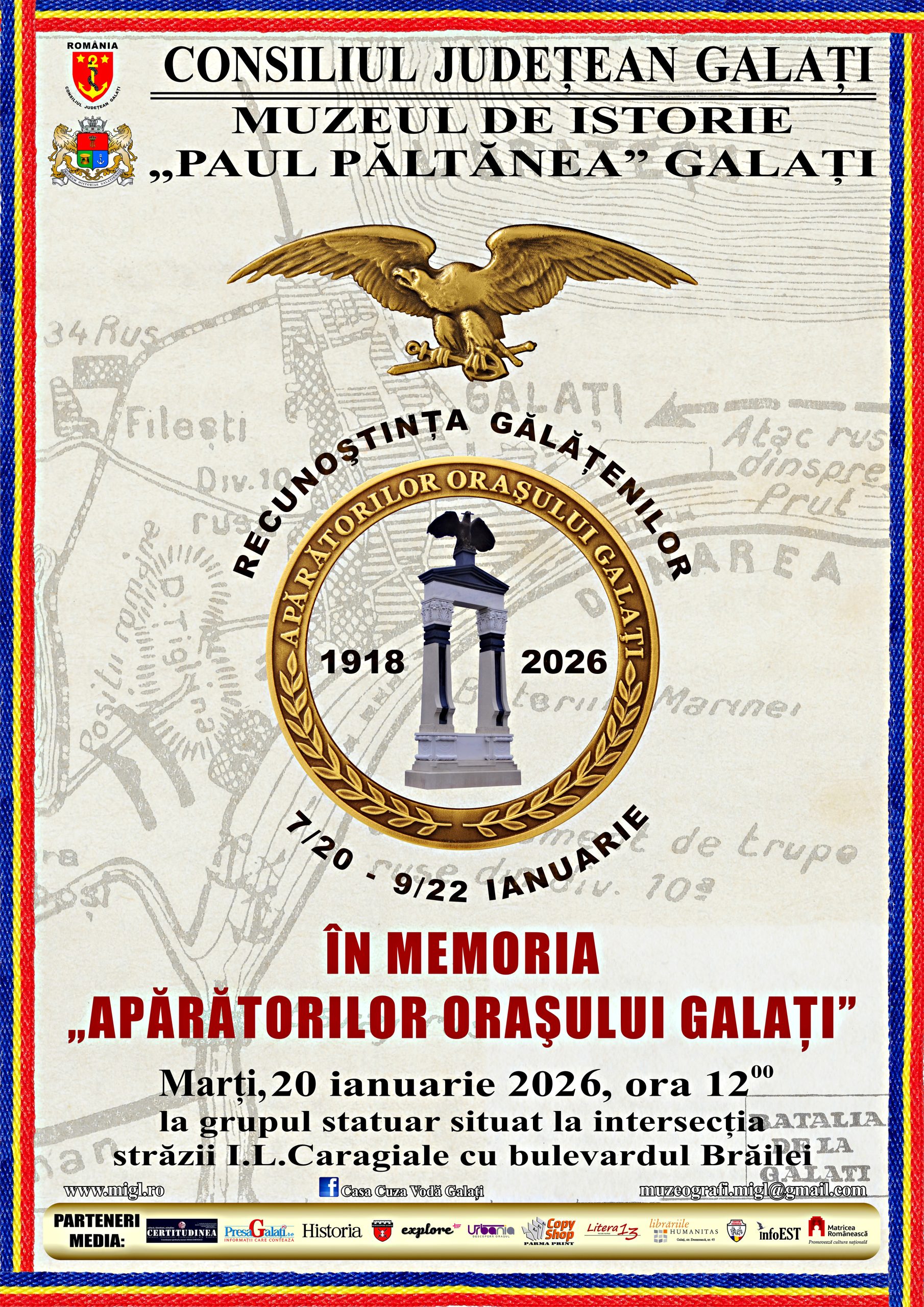 Cu acest prilej, Muzeul de Istorie „Paul Păltănea”, instituţie aflată în subordinea Consiliului Judeţean Galaţi, invită publicul marţi, 20 ianuarie 2026, de la ora 12.00, la Monumentul Apărătorilor oraşului Galaţi, situat la intersecţia bulevardului Brăilei cu strada I.L. Caragiale, în zona STIREX. Evenimentul este dedicat cinstirii memoriei Armatei Române şi a apărătorilor oraşului care s-au jertfit pentru apărarea Galaţiului şi pentru idealul întregirii neamului românesc.