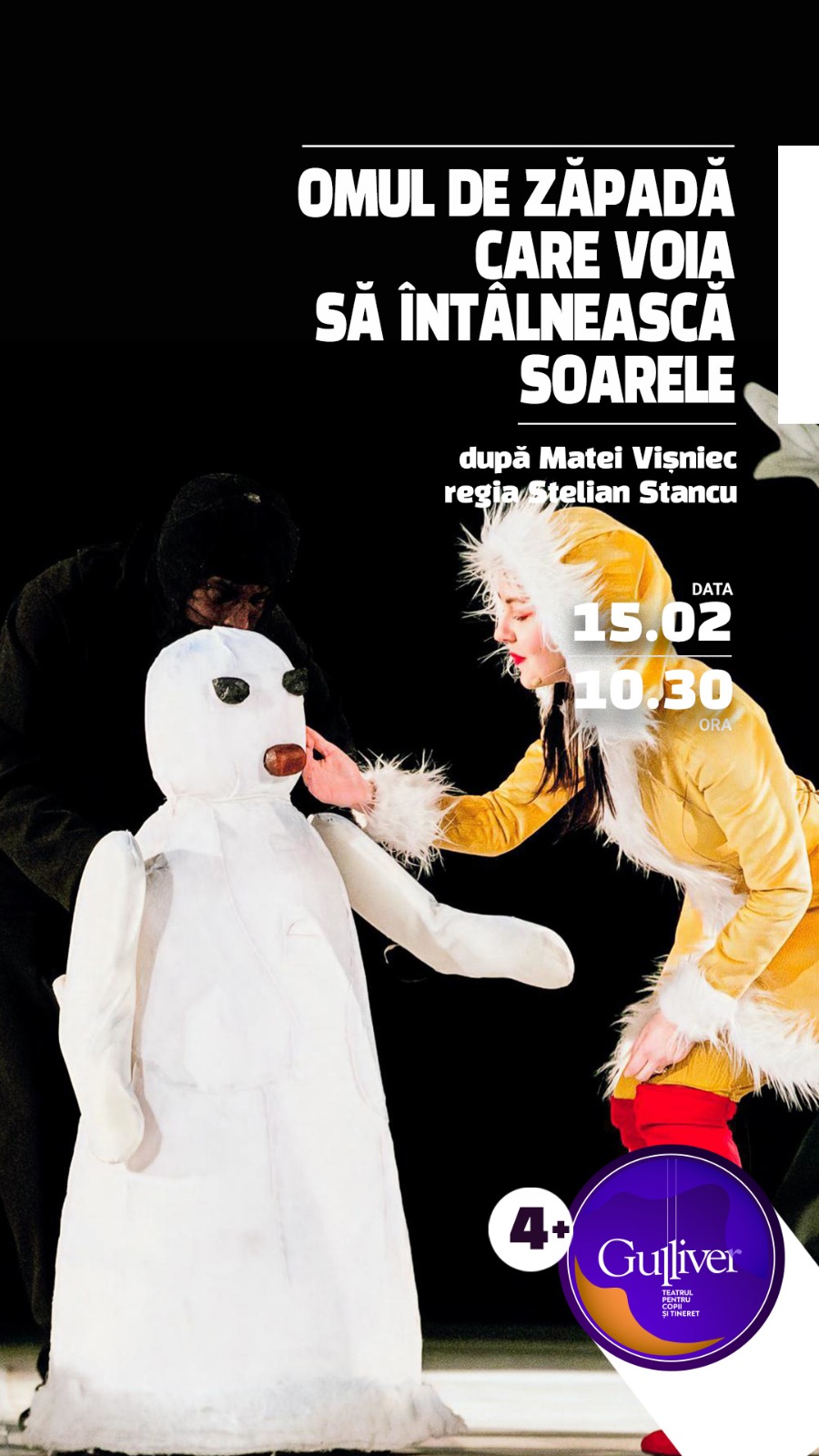Începând cu ora 10:30, spectacolul „Omul de zăpadă care voia să întâlnească soarele”, după Matei Vişniec, oferă spectatorilor o experienţă artistică încărcată de emoţie şi sensibilitate.