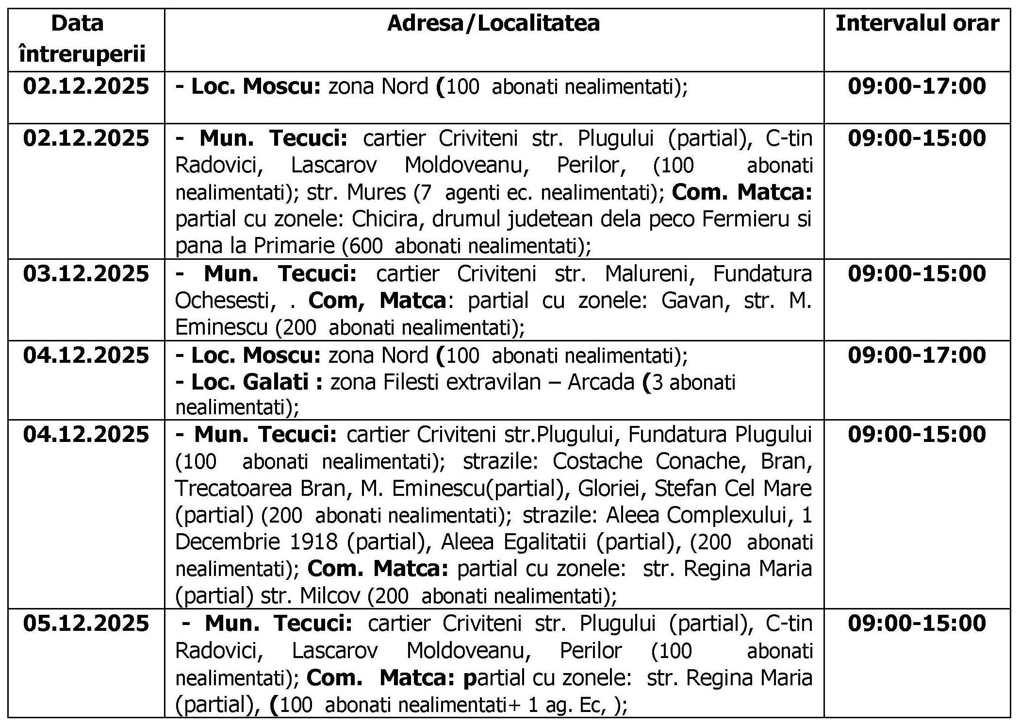 Ne cerem scuze pentru neplăcerile cauzate de aceste întreruperi, care sunt însă necesare pentru asigurarea unei bune funcţionări a instalaţiilor.   Relații suplimentare la telefon 0236 929 sau Telverde 0800 500 205.