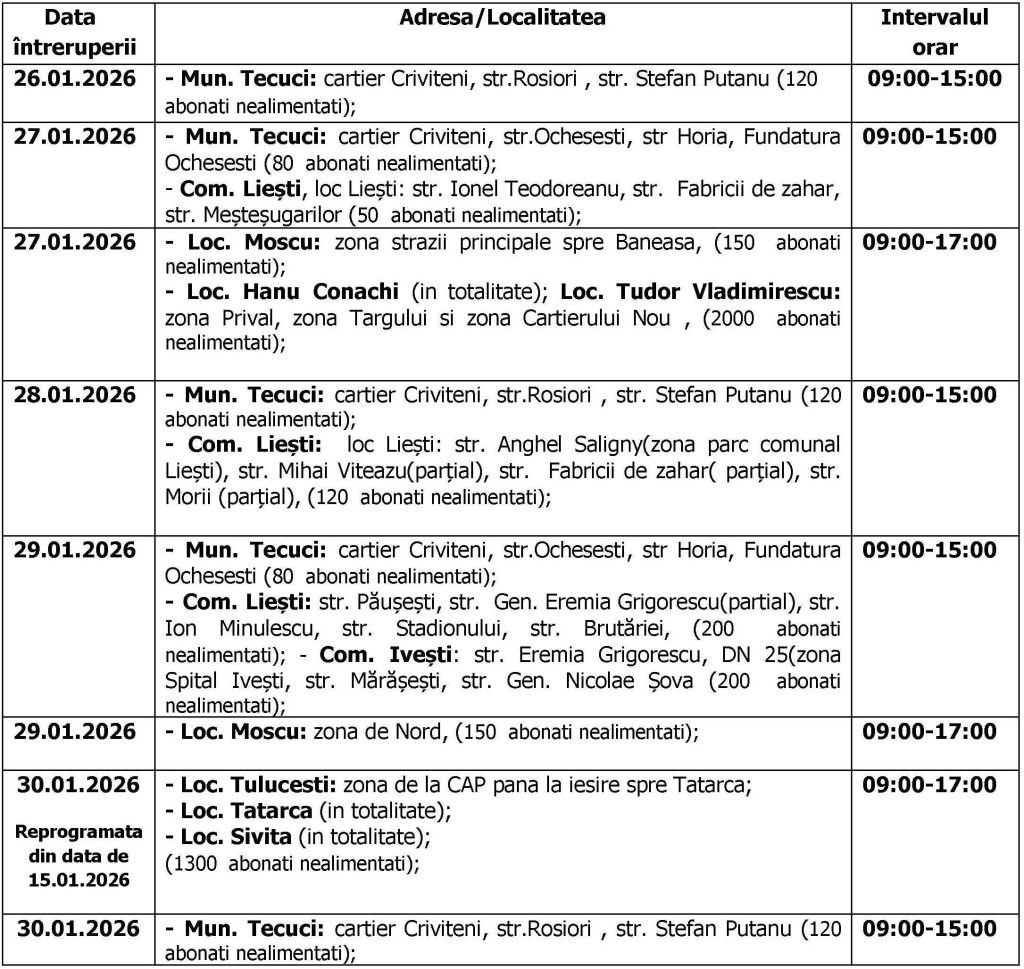 Ne cerem scuze pentru neplăcerile cauzate de aceste întreruperi, care sunt însă necesare pentru asigurarea unei bune funcţionări a instalaţiilor. Relații suplimentare la telefon 0236 929 sau Telverde 0800 500 205.