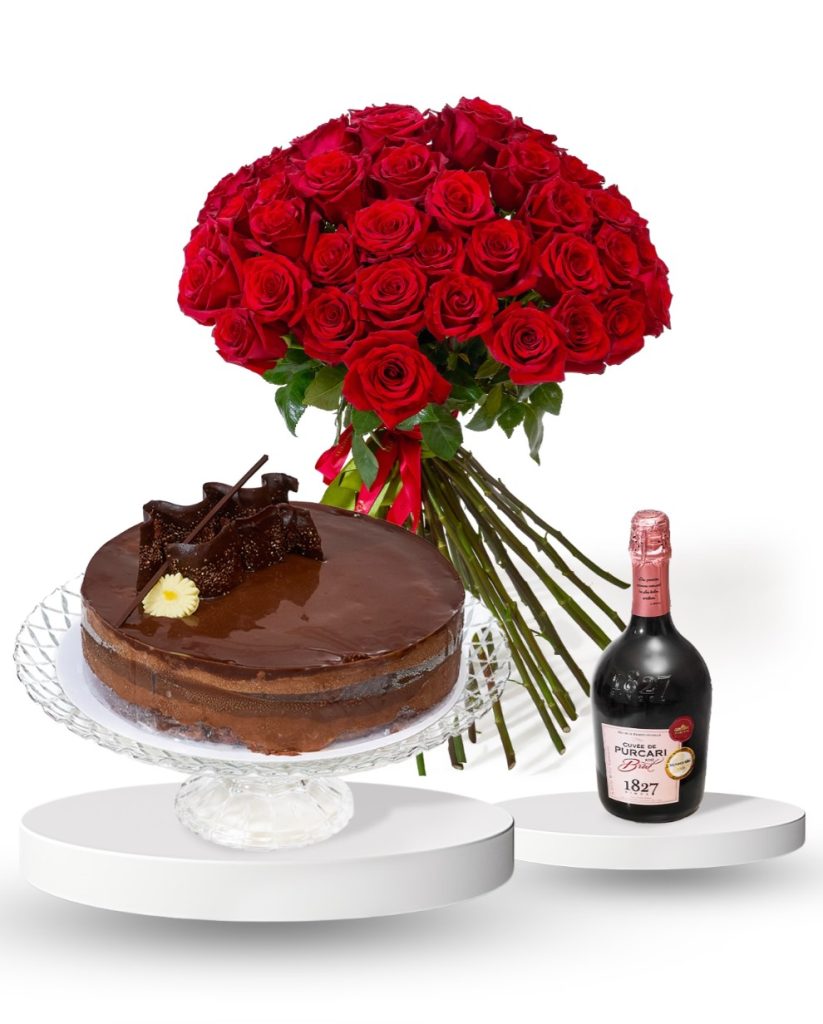 Un exemplu perfect este combinația dintre un buchet impresionant de 49 de trandafiri roșii Scarlet Eternity, un tort elegant și o sticlă de vin premium. Acest trio rafinat transformă o simplă ofertă florală într-o experiență senzorială completă – aromele florilor proaspete se îmbină cu gustul dulce al tortului și notele sofisticate ale unui vin de calitate precum Purcari Cuvée.