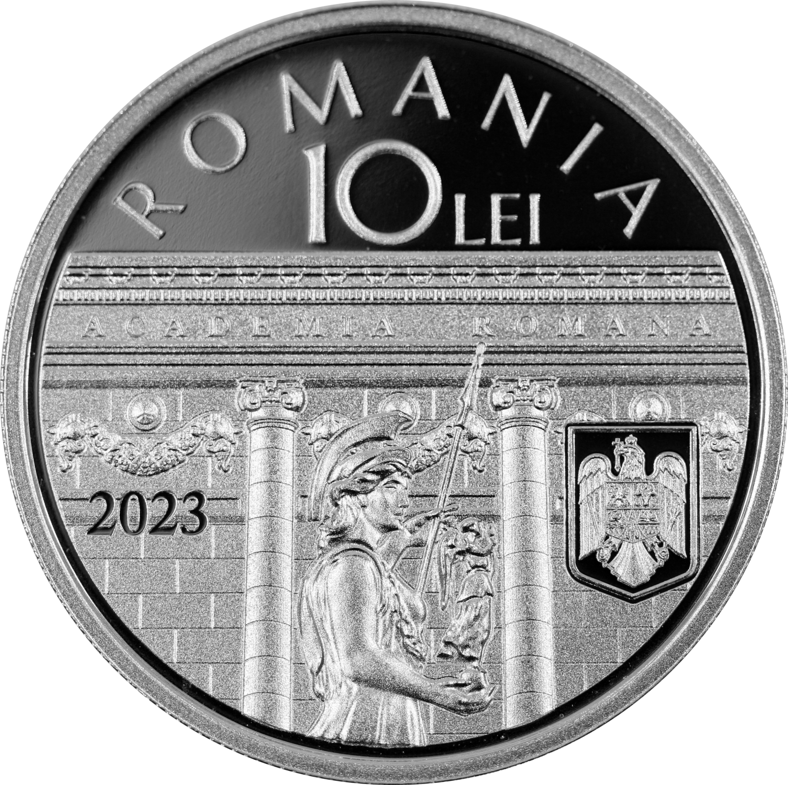 Aversul monedei prezintă un detaliu al sediului Academiei Române din Bucureşti, partea superioară a statuii Minervei din faţa clădirii, stema României, inscripţia „ROMANIA” în arc de cerc, valoarea nominală „10 LEI” şi anul de emisiune „2023”.