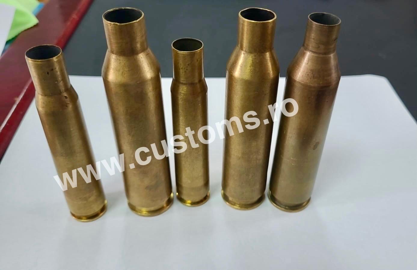 Tuburi de cartuşe de diferite calibre provenind de la muniţie de război, descoperite de inspectorii vamali cu ajutorul scanerului la BVF Galaţi-Giurgiuleşti (foto).