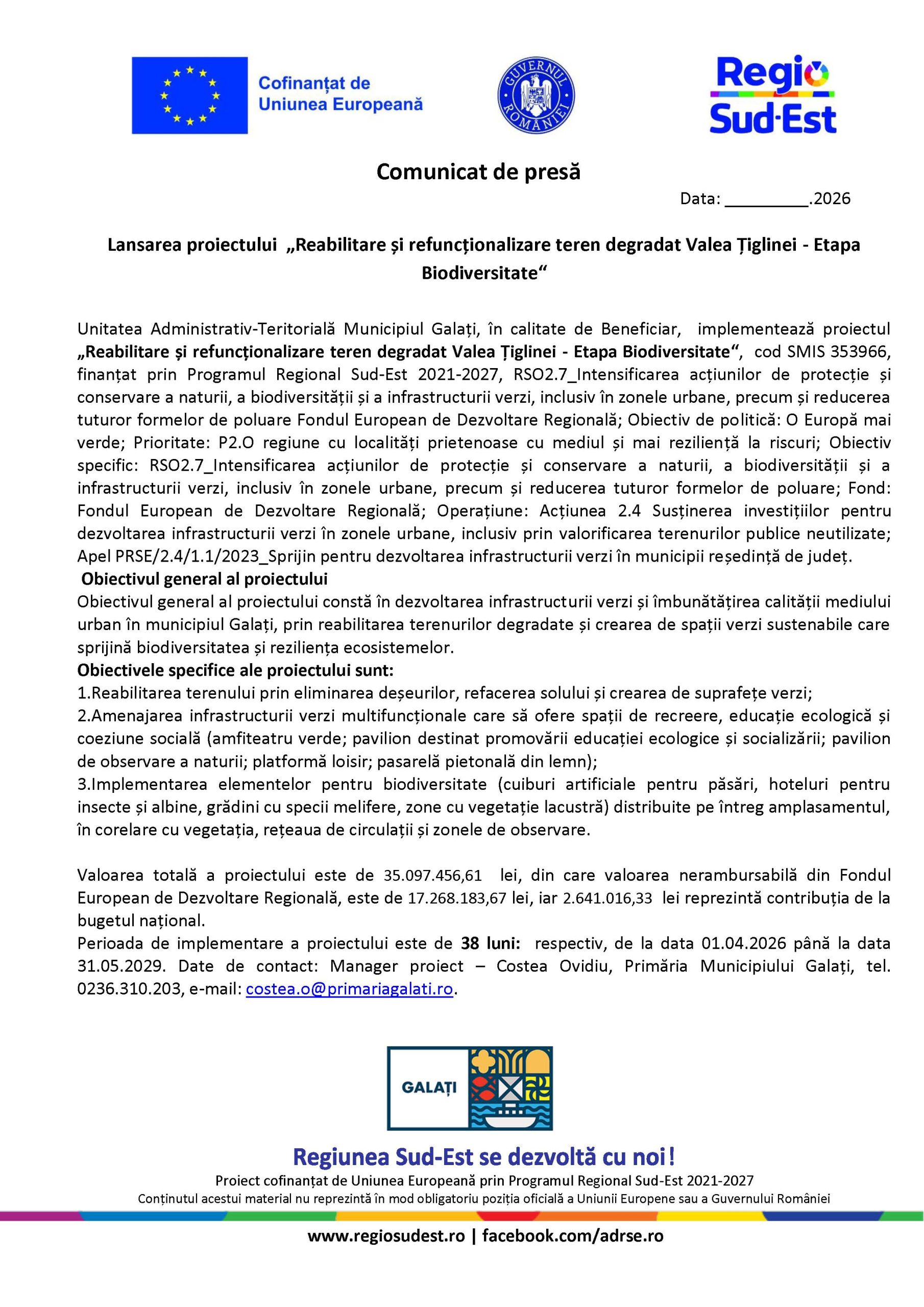 Perioada de implementare a proiectului este de 38 luni:  respectiv, de la data 01.04.2026 până la data 31.05.2029. Date de contact: Manager proiect – Costea Ovidiu, Primăria Municipiului Galați, tel. 0236.310.203, e-mail: costea.o@primariagalati.ro.