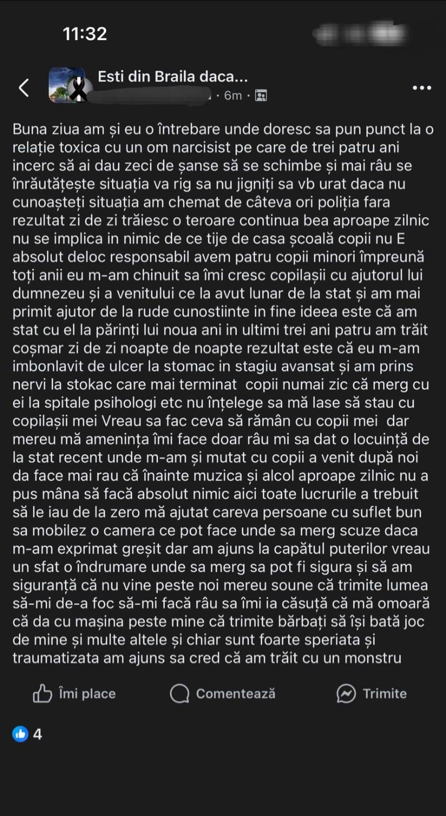O femeie descrie o relație toxică și disperare. Mai mult decât atât, spune că este amenințată de bărbatul cu care locuiește. În scurt timp, postarea este ștearsă.