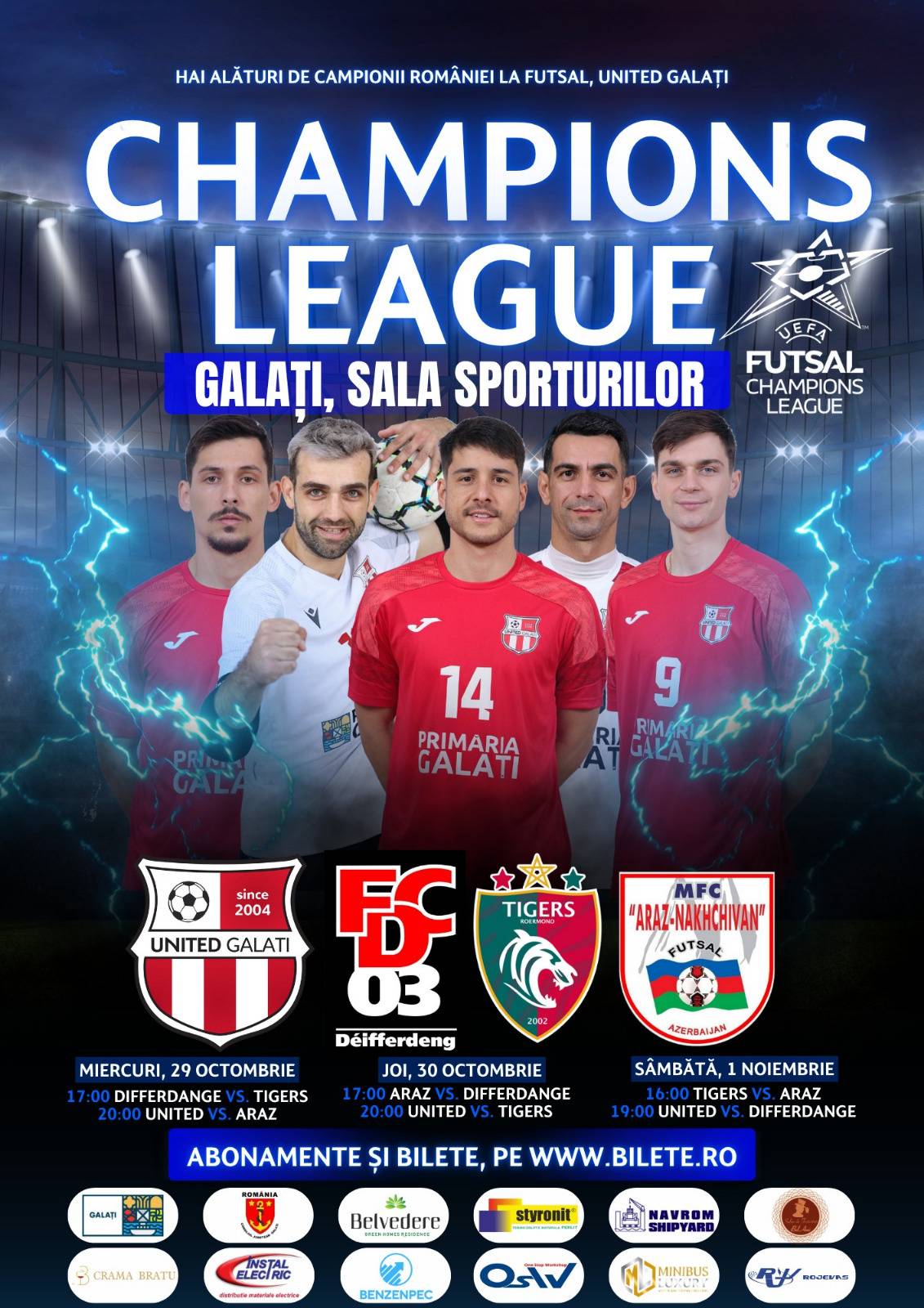 Liga Campionilor la fotbal în sală revine săptămână viitoare în Sala Sporturilor Dunărea din Galaţi. Aşteptarea a luat sfârşit! Abonamentele şi biletele pentru Champions League sunt disponibile. Preţurile sunt accesibile: abonamentul pentru cele 6 meciuri costă 120 de lei: https://bit.ly/abonamente-turneu. Cei interesaţi pot opta şi pentru tichetele de o zi.
