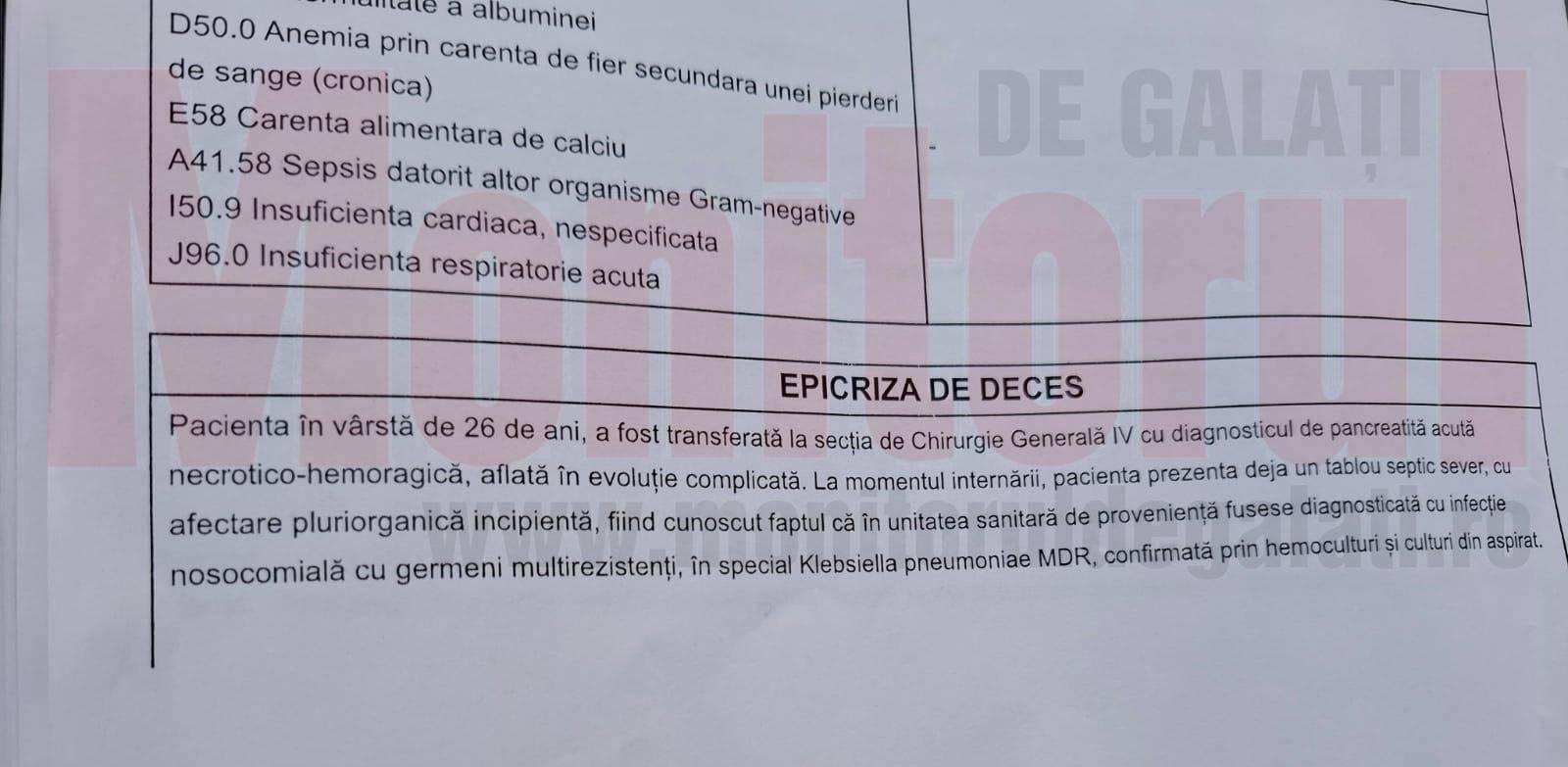 Rudele unei tinere în vârstă de 26 de ani din Galaţi au depus plângeri la Parchet şi la Direcţia de Sănătate Publică, acuzând Spitalul de Urgenţă din Galaţi de neglijenţă. Familia consideră că tânăra, operată de pancreatită în cadrul unităţii medicale, a fost infectată cu Klebsiella, un agent patogen care provoacă o gravă infecţie nosocomială, ceea ce i-a agravat starea şi i-a adus sfârşitul.