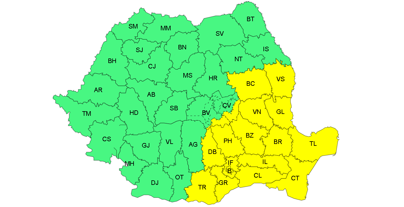 Administraţia Naţională de Meteorologie (ANM) a emis o atenţionare meteorologică COD GALBEN cu interval de valabilitate 06 octombrie 2025, ora 21.00 - 07 octombrie 2025, ora 21.00, fenomenele vizate fiind ploi însemnate cantitativ şi intensificări ale vântului, iar zonele afectate sunt conform textului şi hărţii: